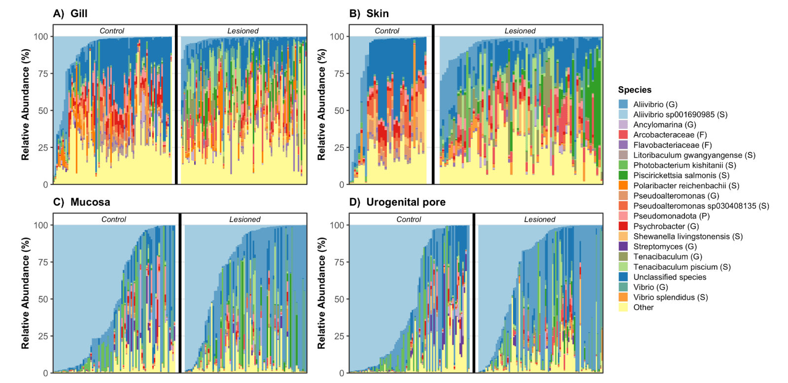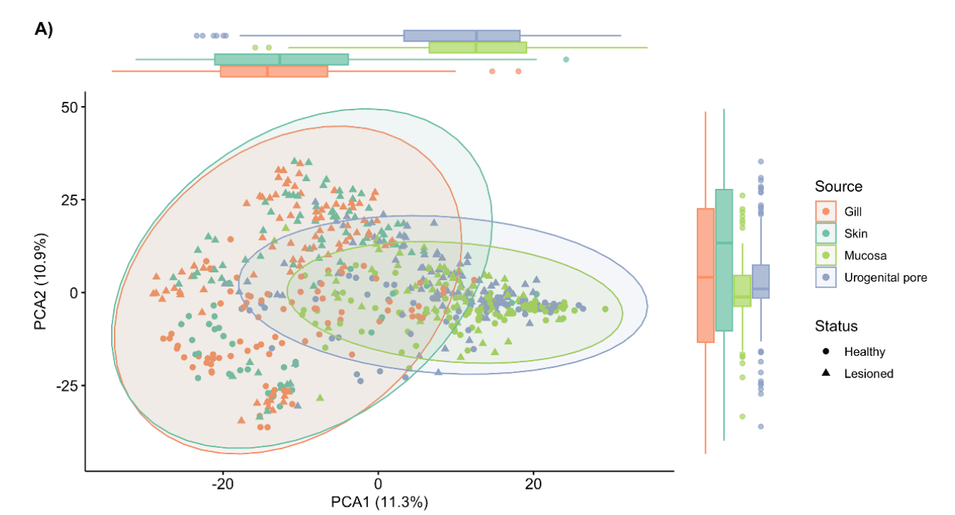 A pesar de que la distribución de muestras de los cuatro sitios anatómicos estuvo balanceada, muchas muestras de piel de los peces sanos no tenían suficiente biomasa. Esto puede ser porque los peces sanos producen menos mucosa en su piel, pero es algo que debe estudiarse.